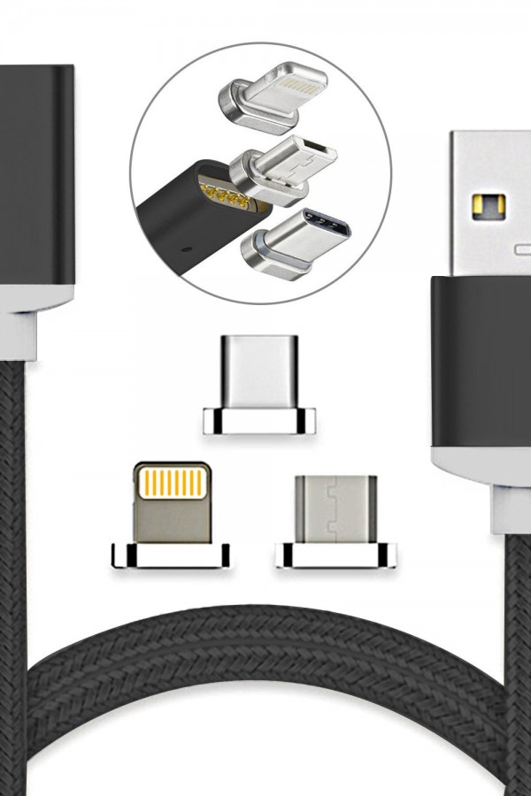 Manyetik Mıknatıslı Şarj Kablosu 3in1 Siyah Hasır-Örgü Dayanıklı 3.4A ARS-C2