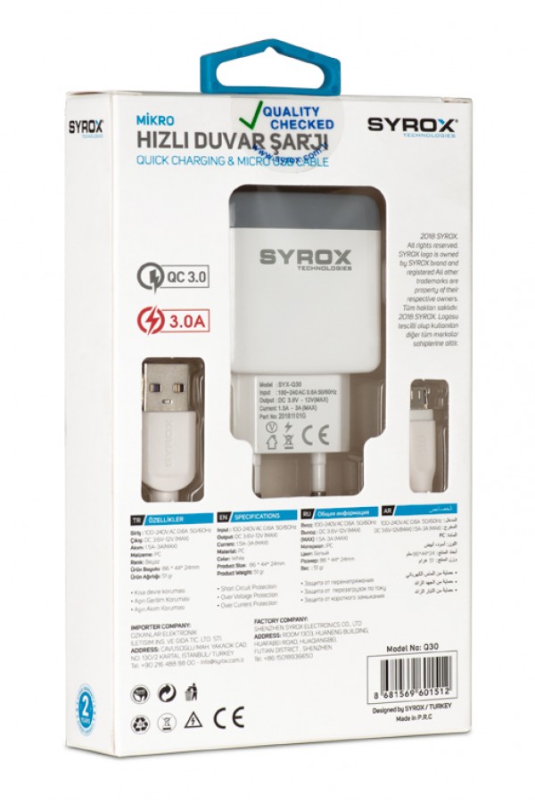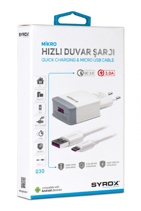 Syrox Q30 QC3.0 Hızlı Şarj Aleti Micro USB Kablo Set - Beyaz